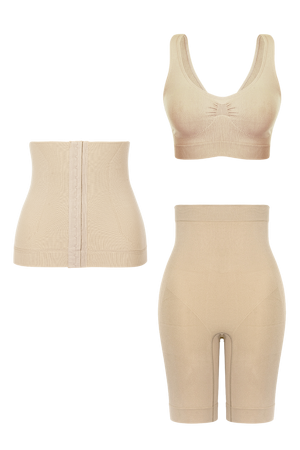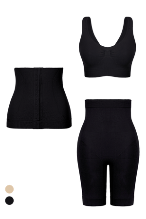 احصلي على قوام مشدود وثقة لا مثيل لها مع مجموعة مشدات الجسم – باقة مكونة من 3 قطع مختارة بعناية لتمنحك نحتًا متكاملاً من الأعلى إلى الأسفل. هذه المجموعة تضم: