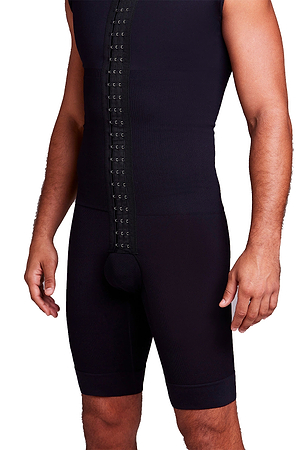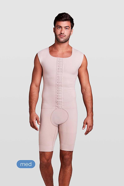 Men's post-surgery top with reinforced fabric and double compression on the breasts. Front adjustment with 3 adjustments. Softness and comfort at the level of the abdomen. Seamless fabric with hydrophilic treatment that allows high skin breathability